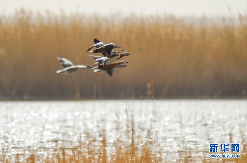 這是在位于內(nèi)蒙古阿拉善盟額濟(jì)納旗的居延海濕地拍攝的候鳥(2021年4月13日攝)。新華社記者 連振 攝