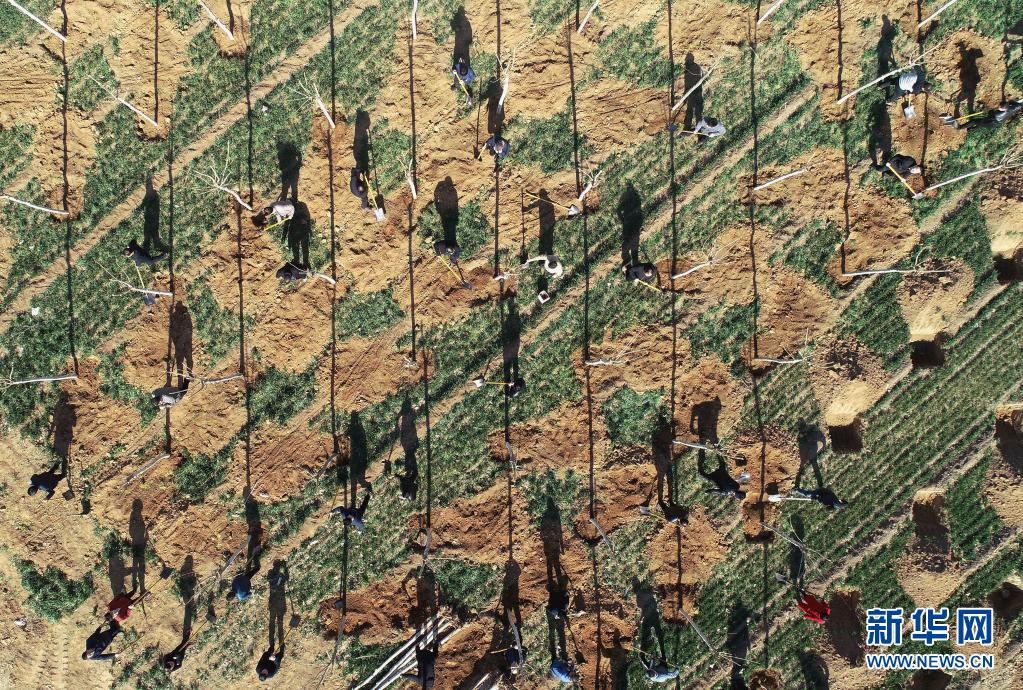 志愿者在河北省武安市伯延鎮(zhèn)伯延村植樹(2019年3月12日攝,無人機(jī)照片)。新華社記者 王曉 攝