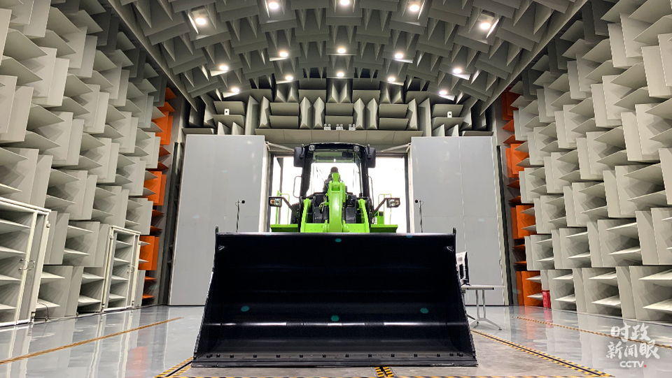 △研發(fā)中心的半消聲實驗室正在為一款純電動裝載機檢測噪聲數(shù)據(jù)。(總臺央視記者程鋮、張曉鵬拍攝)