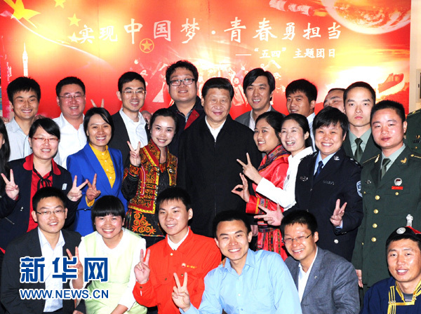 2013年5月4日,中共中央總書(shū)記、國(guó)家主席、中央軍委主席習(xí)近平來(lái)到中國(guó)航天科技集團(tuán)公司中國(guó)空間技術(shù)研究院,同各界優(yōu)秀青年代表座談并發(fā)表重要講話。這是座談會(huì)前,習(xí)近平和在展廳參觀的優(yōu)秀青年代表合影。新華社記者 饒愛(ài)民 攝