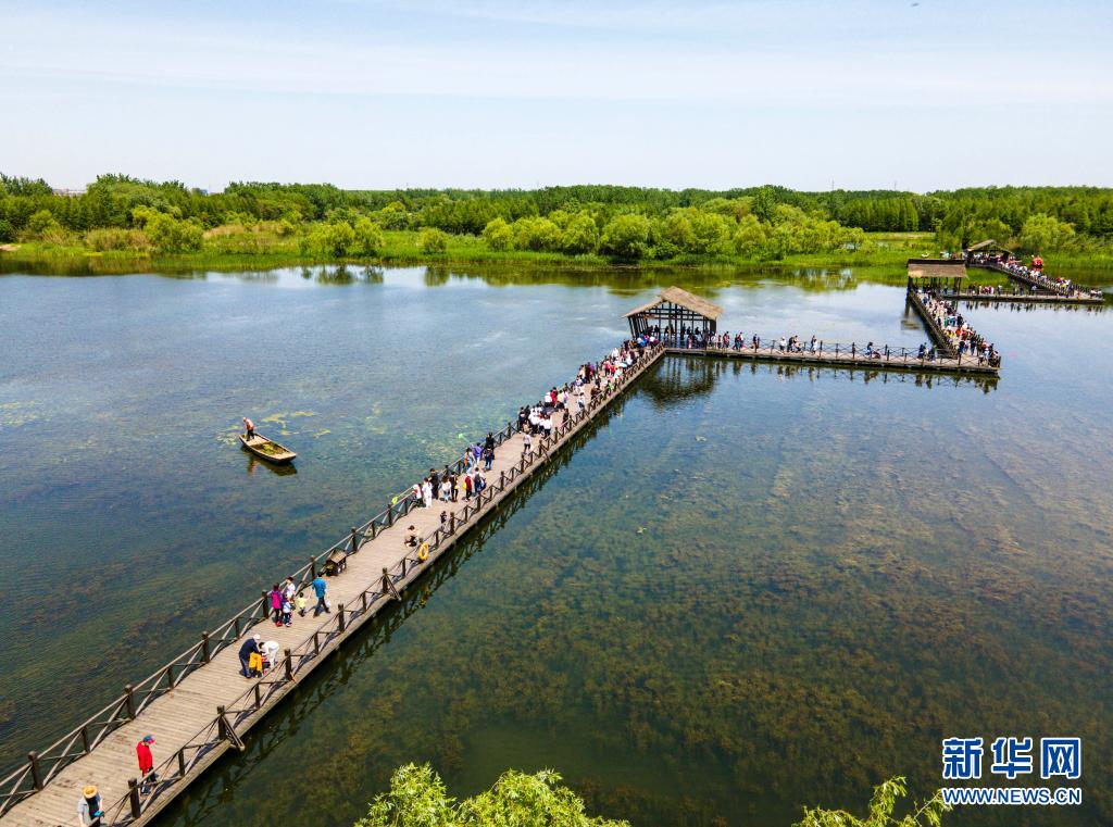 5月2日,游客在江蘇省泰州市姜堰區(qū)溱湖國(guó)家濕地公園棧道上游覽(無(wú)人機(jī)照片)。文化和旅游部5月5日晚間公布2021年“五一”假期旅游市場(chǎng)數(shù)據(jù)。統(tǒng)計(jì)顯示,5月1日至5日,全國(guó)國(guó)內(nèi)旅游出游2.3億人次,同比增長(zhǎng)119.7%,按可比口徑恢復(fù)至疫前同期的103.2%。新華社發(fā)(顧繼紅 攝)