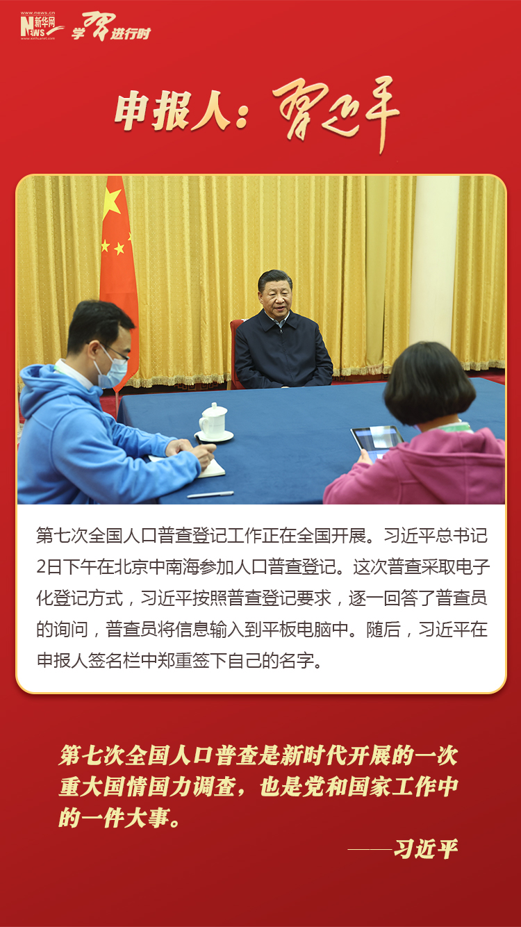 習(xí)近平在北京中南海參加全國人口普查登記,帶頭申報(bào)。他按照普查登記要求,逐一回答了普查員的詢問,并在申報(bào)人簽名欄中鄭重簽下自己的名字。