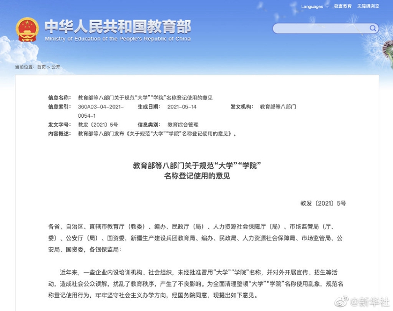 教育部等八部門近日印發(fā)意見,規(guī)范大學(xué)學(xué)院名稱登記使用。教育部表示,一些企業(yè)內(nèi)設(shè)培訓(xùn)機(jī)構(gòu)、社會組織,未經(jīng)批準(zhǔn)冒用“大學(xué)”“學(xué)院”名稱,并對外開展宣傳、招生等活動,造成社會公眾誤解,擾亂了教育秩序。意見明確,“大學(xué)”“學(xué)院”名稱經(jīng)審批方可使用。大學(xué)由國務(wù)院教育行政部門依法審批或備案;學(xué)院根據(jù)辦學(xué)層次、類型、法人性質(zhì)等,由中央和國家有關(guān)部門或省級人民政府及其有關(guān)部門依法審批。涉及機(jī)構(gòu)編制事項(xiàng)的,按照機(jī)構(gòu)編制管理權(quán)限和規(guī)定程序,報機(jī)構(gòu)編制部門審批。(記者胡浩)