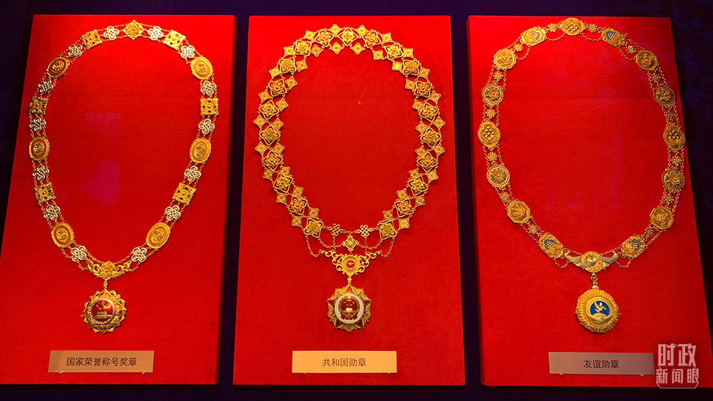 △從左至右分別是國家榮譽稱號獎?wù)?、共和國勛章、友誼勛章(總臺央視記者石丞拍攝)