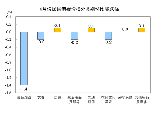 6月份,全國居民消費(fèi)價(jià)格環(huán)比下降0.4%。其中,城市下降0.4%,農(nóng)村下降0.5%;食品價(jià)格下降2.2%,非食品價(jià)格持平;消費(fèi)品價(jià)格下降0.6%,服務(wù)價(jià)格下降0.1%。