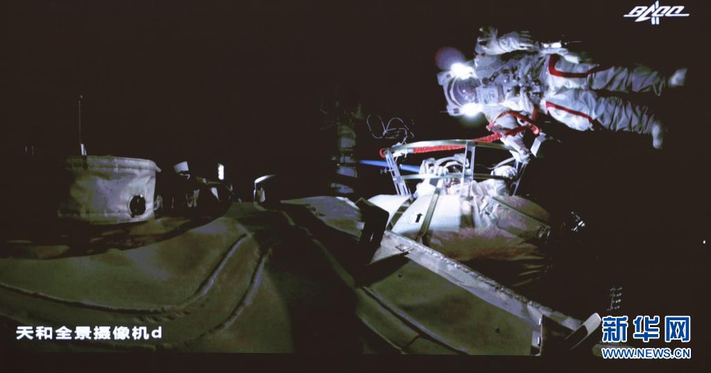 7月4日在北京航天飛行控制中心大屏拍攝的神舟十二號乘組航天員劉伯明、湯洪波在艙外工作場面。新華社記者 金立旺 攝