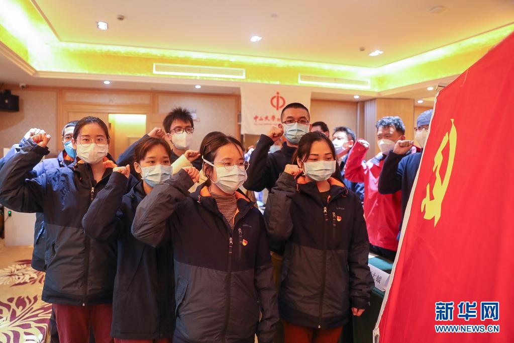 廣州中山大學(xué)附屬第一醫(yī)院馳援武漢醫(yī)療隊(duì)火線入黨的新黨員在武漢漢口醫(yī)院宣誓(2020年3月2日攝)。新華社發(fā)