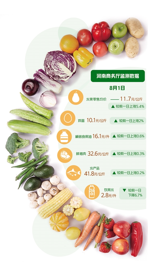 據(jù)了解,河南省商務(wù)廳自7月21日起便啟動了生活必需品市場監(jiān)測日報,對河南全省220家樣本企業(yè)、11個大類、72個品種商品實(shí)施監(jiān)測。8月1日監(jiān)測數(shù)據(jù)顯示,72個品種較前一日相比呈現(xiàn)“36漲14平22降”。分大類看,水果零售均價為11.7元/公斤、雞蛋10.1元/公斤、桶裝食用油16.1元/升、鮮豬肉32.6元/公斤、水產(chǎn)品41.8元/公斤,較前一日分別上漲5.4%、2%、0.6%、0.3%、0.2%;飲用水2.8元/升,較前一日下降6.7%;糧食5元/公斤、蔬菜5.7元/公斤,與前一日持平。