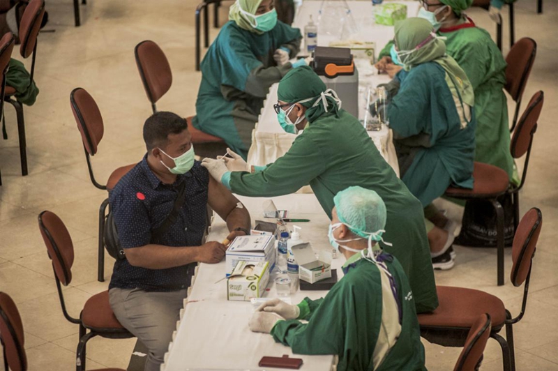 1月28日,一名醫(yī)務(wù)工作者在印度尼西亞日惹接種中國科興公司的新冠疫苗。新華社發(fā)(蘇普里揚托攝)