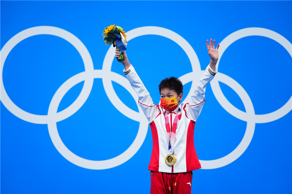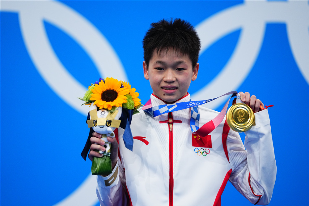 2021年8月5日,全紅嬋在頒獎(jiǎng)儀式上。當(dāng)日,在東京奧運(yùn)會(huì)跳水項(xiàng)目女子10米跳臺(tái)決賽中,中國選手全紅嬋奪得冠軍。新華社記者 許暢 攝