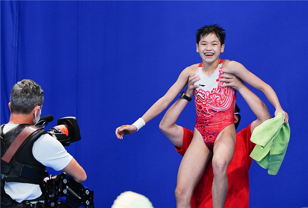 2021年8月5日,全紅嬋(上)在比賽后慶祝。當(dāng)日,在東京奧運(yùn)會(huì)跳水項(xiàng)目女子10米跳臺(tái)決賽中,中國選手全紅嬋奪得冠軍。新華社記者 許暢 攝