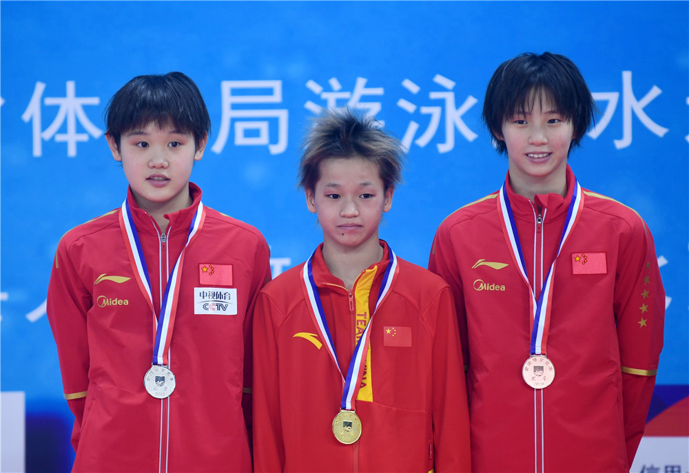 2020年10月4日,冠軍廣東海印隊(duì)選手全紅嬋(中)、亞軍北京水立方隊(duì)選手張家齊(左)和季軍上海浩沙隊(duì)選手陳芋汐在頒獎(jiǎng)儀式上。當(dāng)日,在河北奧體中心舉行的2020年全國跳水冠軍賽暨東京奧運(yùn)會(huì)、世界杯預(yù)選賽女子10米跳臺(tái)決賽中,全紅嬋奪得冠軍。新華社記者 王曉 攝