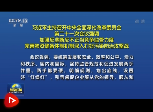央視網(wǎng)消息(新聞聯(lián)播):中共中央總書記、國家主席、中央軍委主席、中央全面深化改革委員會主任習近平8月30日下午主持召開中央全面深化改革委員會第二十一次會議,審議通過了《關于強化反壟斷深入推進公平競爭政策實施的意見》、《關于改革完善體制機制加強戰(zhàn)略和應急物資儲備安全管理的若干意見》、《關于深入打好污染防治攻堅戰(zhàn)的意見》、《關于更加有效發(fā)揮統(tǒng)計監(jiān)督職能作用的意見》。