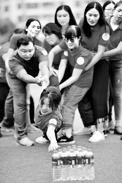 安徽省合肥市琥珀名城小學(xué)教師們參加特色拓展訓(xùn)練,在團(tuán)隊協(xié)作中凝聚智慧力量。熊偉攝/光明圖片