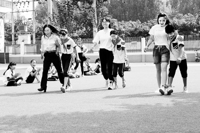 河北省邯鄲市廣平縣濱河小學(xué)教師們和學(xué)生一起在趣味運動活動中參加“二人三足跑”項目。程學(xué)虎攝/光明圖片