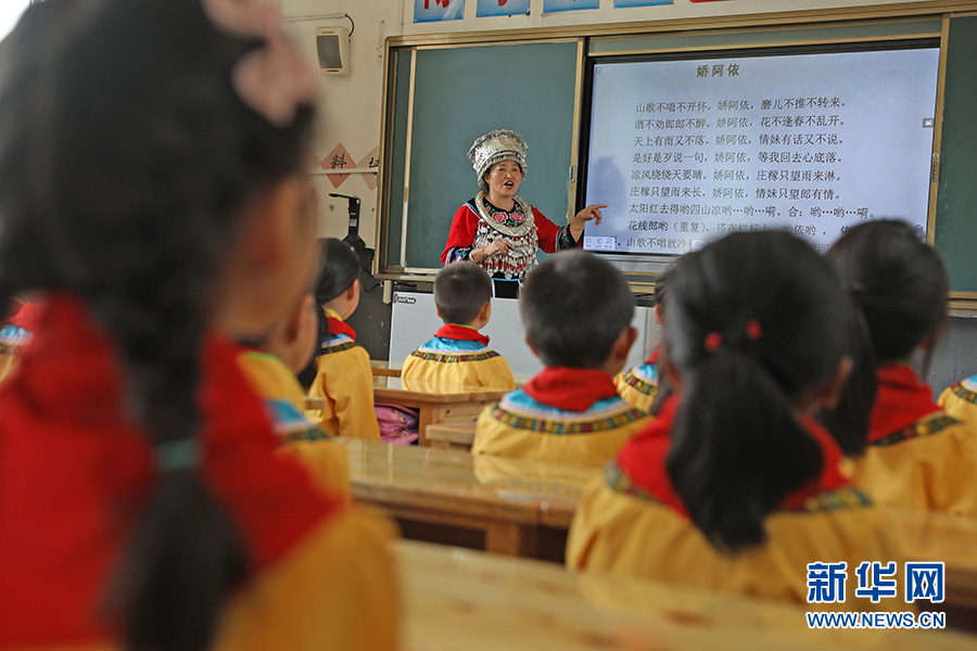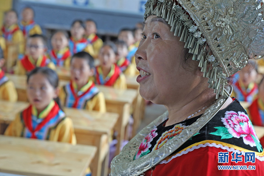 9月28日,“苗族民歌”非物質(zhì)文化遺產(chǎn)傳承人任茂淑正在課堂上教孩子們傳唱苗族民歌代表作《嬌阿依》。新華網(wǎng)發(fā)(趙勇 攝)