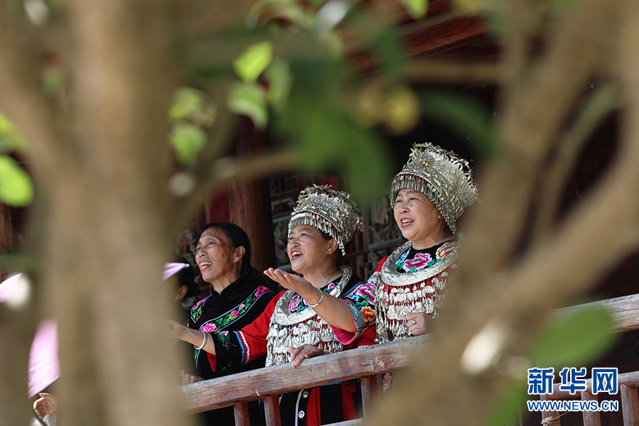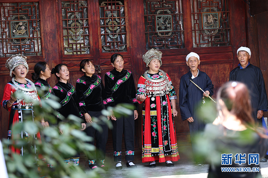 9月28日,在彭水自治縣鞍子鎮(zhèn)羅家坨苗寨,村民們正在綠樹(shù)掩映的吊腳樓上演唱苗族民歌。新華網(wǎng)發(fā)(趙勇 攝)