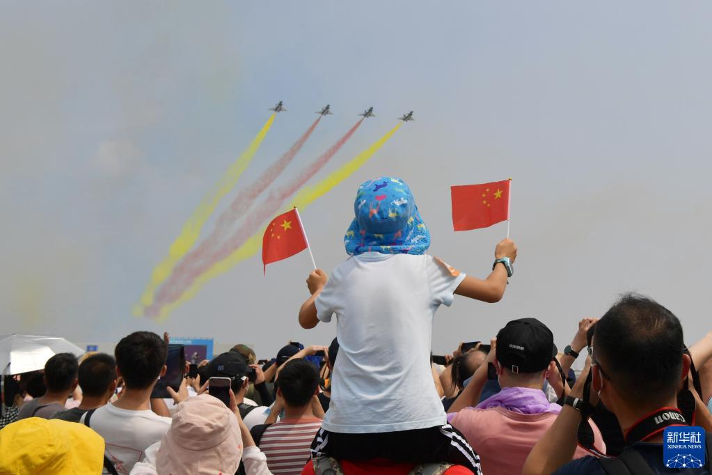 10月1日,在第十三屆中國國際航空航天博覽會上,中國空軍八一飛行表演隊飛行員舉國旗向觀眾致意。新華社記者 琚振華 攝