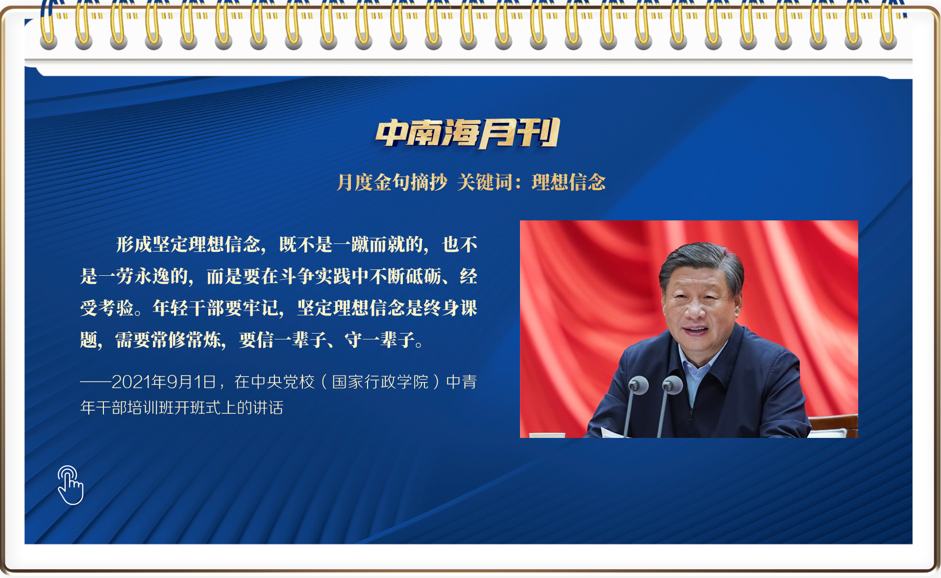 九月的第一天,總書(shū)記在2021年秋季學(xué)期中央黨校(國(guó)家行政學(xué)院)中青年干部培訓(xùn)班開(kāi)班式上,為中青年干部講授重要一課。九月的最后一天,總書(shū)記在北京天安門(mén)廣場(chǎng)出席烈士紀(jì)念日向人民英雄敬獻(xiàn)花籃儀式,崇尚英雄、致敬英雄,以行動(dòng)為我們?cè)俅紊狭松鷦?dòng)一課。不忘本,才能開(kāi)辟未來(lái)。