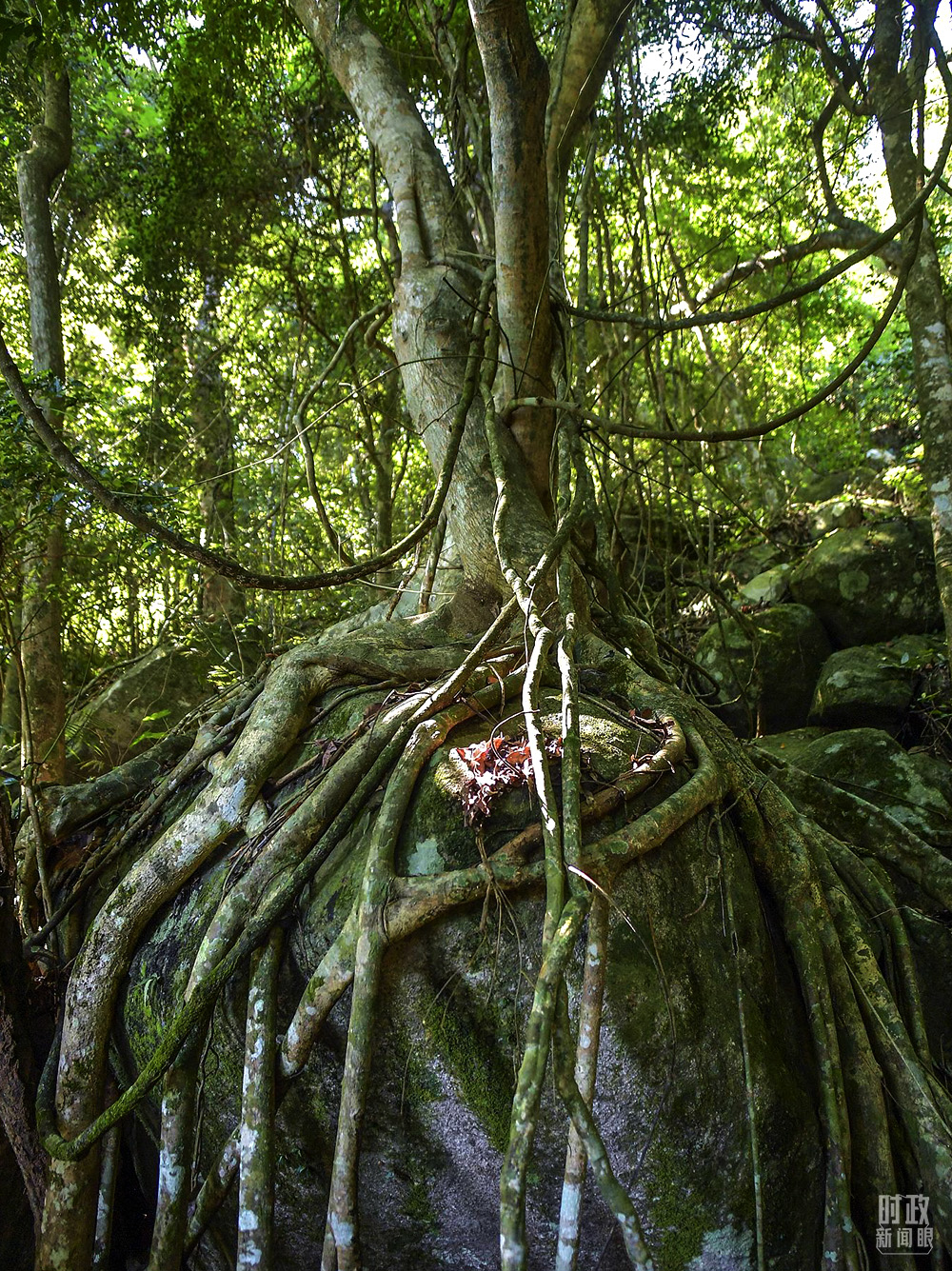 △海南霸王嶺自然保護區(qū),熱帶雨林中的“根抱石”現(xiàn)象。(圖/視覺中國)