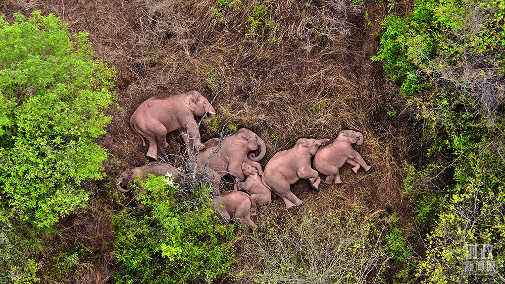 △2021年6月7日,云南省森林消防總隊的無人機監(jiān)測人員觀測到野象群暫停遷徙的一幕。這是監(jiān)測野象12天來,第一次發(fā)現(xiàn)象群集體躺著睡覺。(圖/視覺中國)