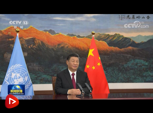 △習(xí)近平主席通過視頻方式發(fā)表主旨講話。(總臺央視記者胡瑋拍攝)