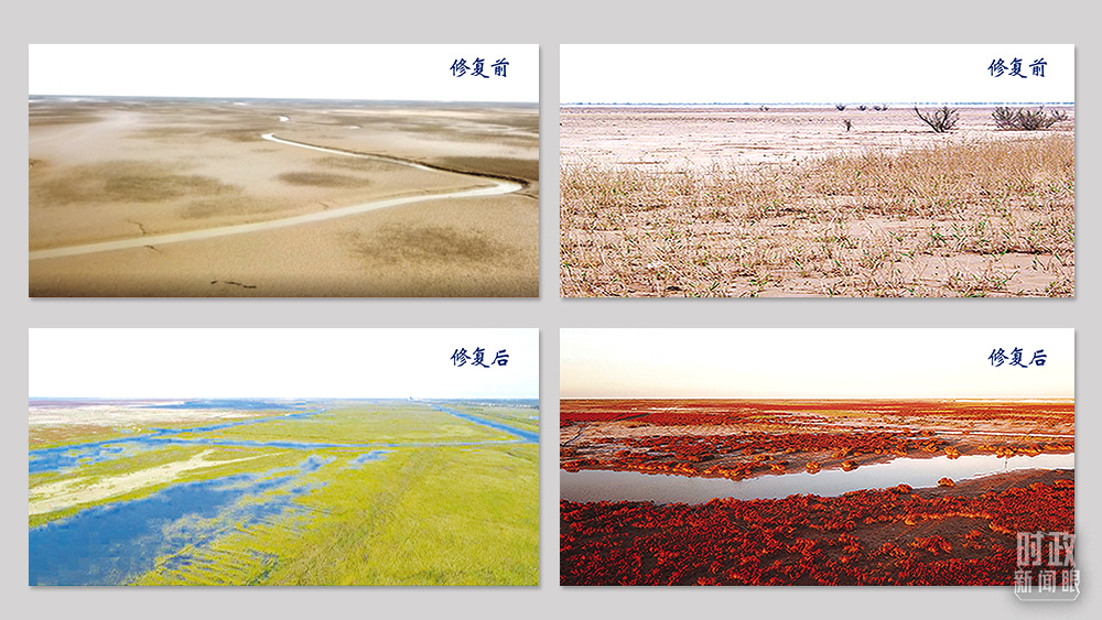 △黃河口河流沼澤濕地(左)和鹽沼濕地(右)生態(tài)修復(fù)對(duì)比圖。(總臺(tái)央視記者盧心雨提供)