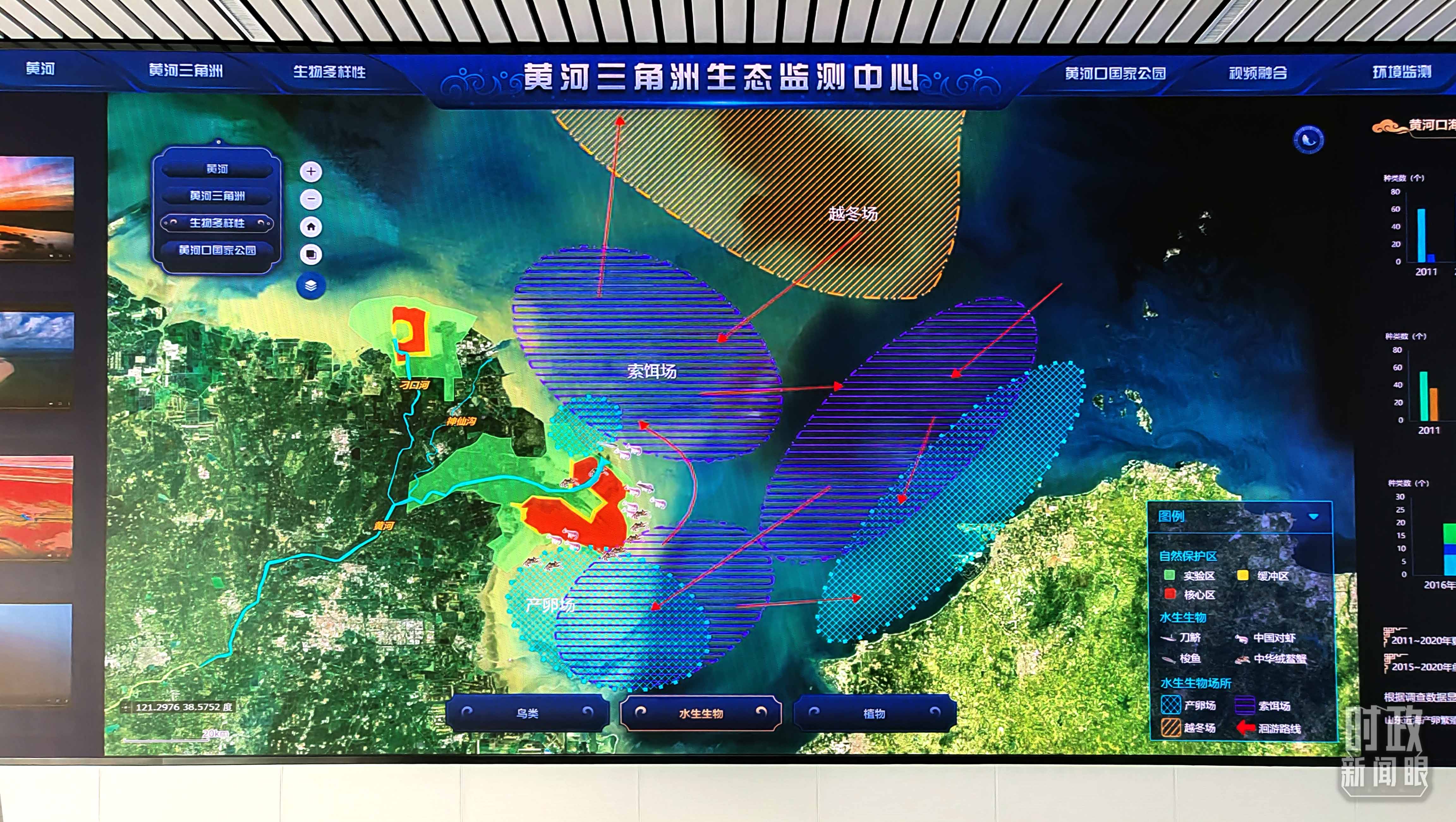 △監(jiān)測(cè)中心大屏幕正在顯示黃河三角洲水生生物場(chǎng)所,包括產(chǎn)卵場(chǎng)、索餌場(chǎng)、越冬場(chǎng)。(總臺(tái)央視記者彭漢明拍攝)