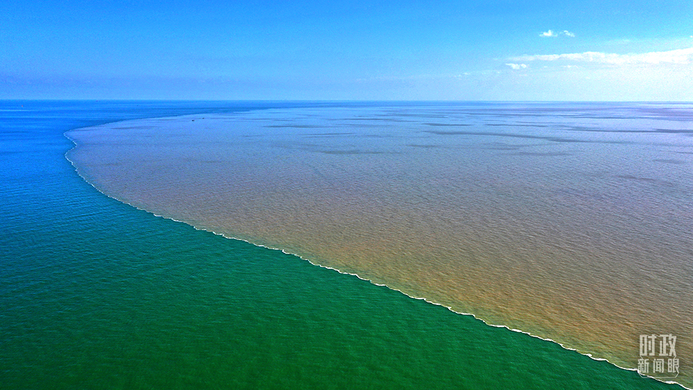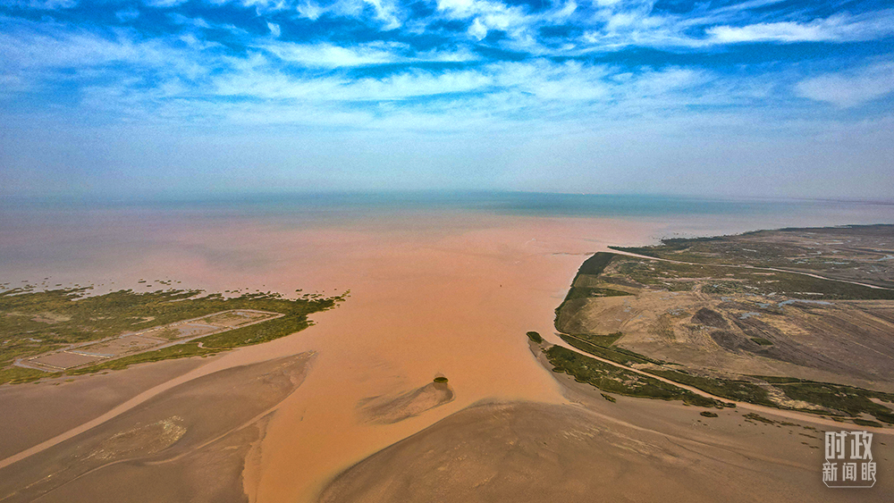 △俯瞰入???,雄渾的黃河與碧藍(lán)的大海相融。(總臺(tái)央視記者程鋮拍攝)