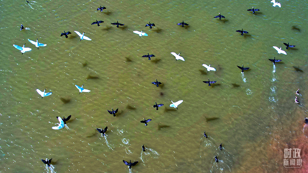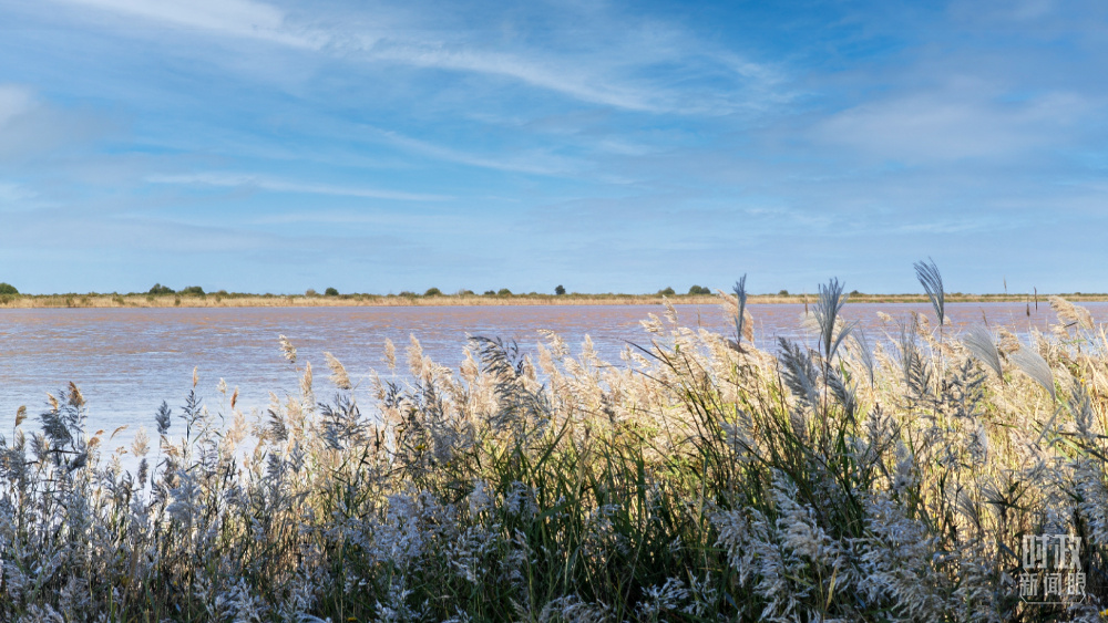 △當(dāng)天的黃河三角洲上,蘆花飄搖、候鳥(niǎo)成群。(總臺(tái)央視記者彭漢明、國(guó)廣記者李晉拍攝)