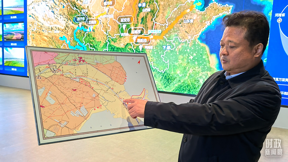 △黃河河口管理局局長(zhǎng)裴明勝正在介紹黃河三角洲的防洪設(shè)施建設(shè)。(總臺(tái)央視記者韓銳拍攝)