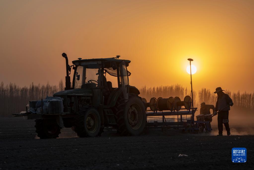 春播時(shí)節(jié),陸德文駕駛采棉機(jī)在棉田播種,兩名工人在車后跟隨保障,隨時(shí)進(jìn)行壓地膜、補(bǔ)充棉種和處理故障等作業(yè)(4月14日攝)。新華社記者 胡虎虎 攝