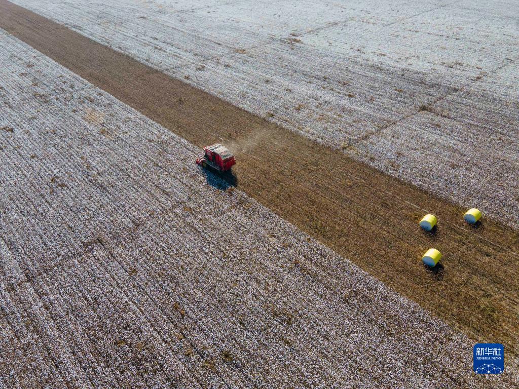 這是在新疆塔城地區(qū)沙灣市大泉鄉(xiāng)三道溝村拍攝的陸高林家的棉田(10月24日攝,無人機(jī)照片)。畫面左側(cè)為已采收的棉田,棉包擺放在地上,待價(jià)格合適時(shí),這些棉包將被運(yùn)往軋花廠售賣;右側(cè)為待采收的地塊。新華社記者 胡虎虎 攝