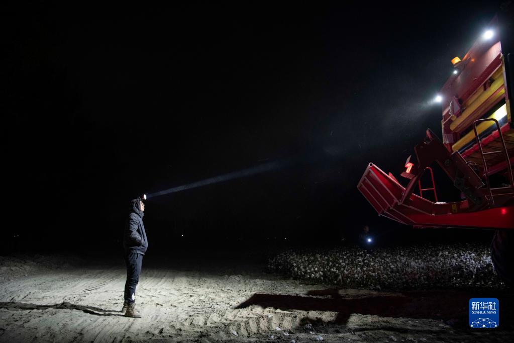 夜幕降臨,陸德文在棉田里守候采棉機(jī)轉(zhuǎn)場(chǎng)(10月22日攝)。新華社記者 胡虎虎 攝