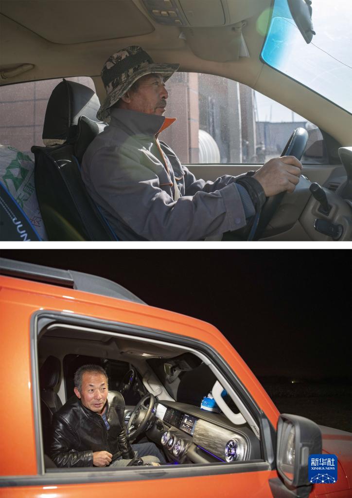 拼版照片:上圖為春播時(shí)節(jié),陸高林開車載著農(nóng)資去棉田干活(4月15日攝);下圖為秋收時(shí)節(jié),陸高林在新?lián)Q的越野車內(nèi)等候采棉機(jī)轉(zhuǎn)場(chǎng)(10月22日攝)。新華社記者 胡虎虎 攝