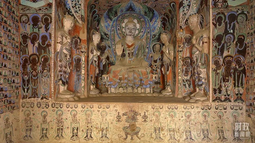 △敦煌莫高窟第420窟,創(chuàng)建于隋,南、西、北壁各開一龕,被稱為“三龕窟”。敦煌文化被認為集建筑藝術(shù)、彩塑藝術(shù)、壁畫藝術(shù)、佛教文化于一身。(資料圖)