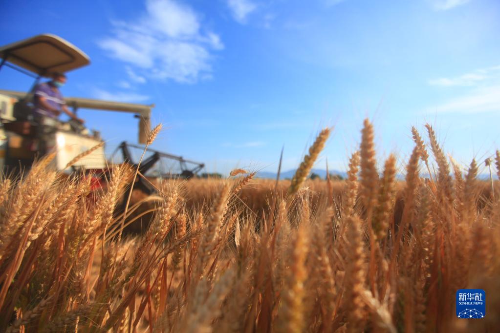 收割機在山東省臨沂市平邑縣的麥田里收割小麥(6月8日攝)。新華社發(fā)(武紀全 攝)