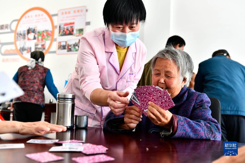 在山東省東營市墾利區(qū)楊廟社區(qū)養(yǎng)老服務中心,工作人員陪老人打撲克(10月18日攝)。新華社記者 郭緒雷 攝
