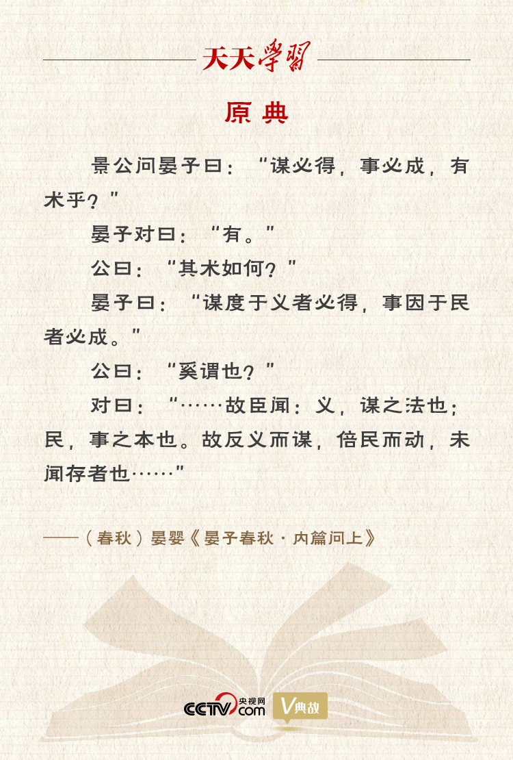“謀度于義者必得,事因于民者必成”出自《晏子春秋》,意思是謀劃時(shí)考慮符合道義的就一定能夠?qū)崿F(xiàn),做事時(shí)注重順從民意的就一定能夠成功。