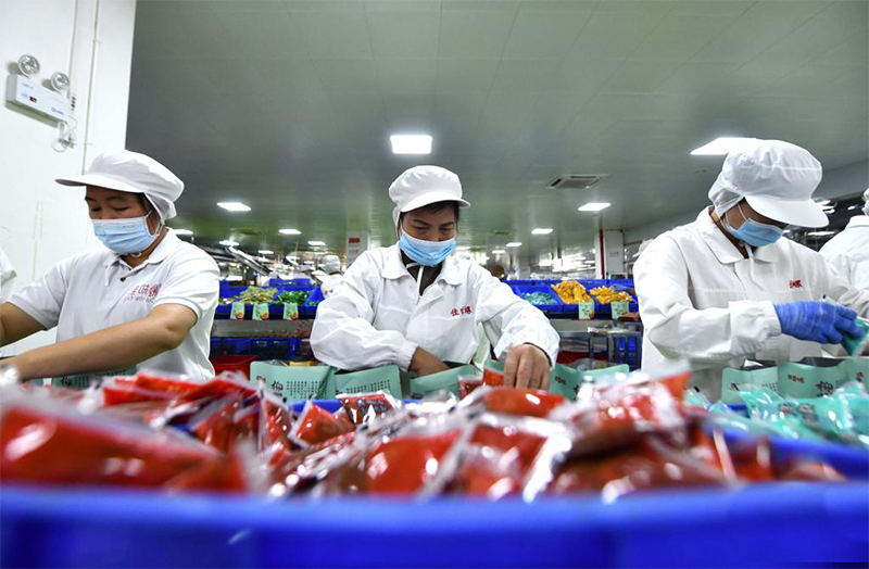在廣西一食品有限公司螺螄粉生產(chǎn)車(chē)間,工人在生產(chǎn)線(xiàn)上包裝螺螄粉。