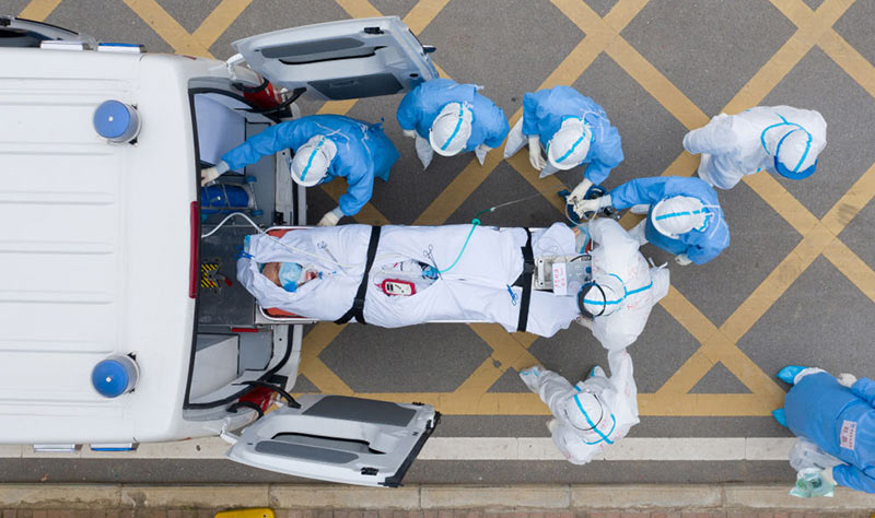 2020年3月6日,在湖北省武漢市的華中科技大學(xué)附屬同濟(jì)醫(yī)院中法新城院區(qū),醫(yī)護(hù)人員用負(fù)壓救護(hù)車(chē)轉(zhuǎn)運(yùn)一位新冠肺炎患者做CT檢查(無(wú)人機(jī)照片)。