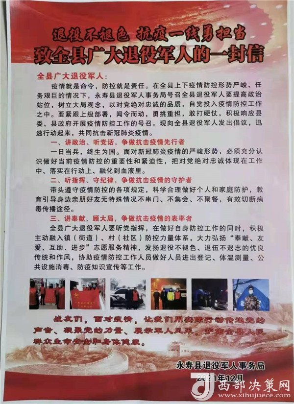 12月24日,永壽縣退役軍人事務局向全縣廣大退役軍人發(fā)出了《退役不褪色,抗疫一線勇?lián)敗返囊环庑?,倡議一發(fā)出,志愿者們紛紛主動請纓,聯(lián)名遞交了疫情防控一線作戰(zhàn)的請戰(zhàn)書。連夜集結,在永壽縣退役軍人事務局召開了“抗擊疫情沖鋒在前”退役軍人志愿者誓師動員大會,局主要負責同志向廣大退役軍人志愿者作了戰(zhàn)前動員,大家激情高漲,“必勝、必勝、必勝”的口號響徹整個大樓,用實際行動堅守在疫情防治的第一線。