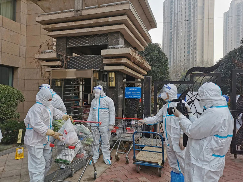 2021年12月25日,西安日報社記者李東峰(右)在采訪之余,為西安市蓮湖區(qū)勞動一坊社區(qū)居家隔離戶送菜。