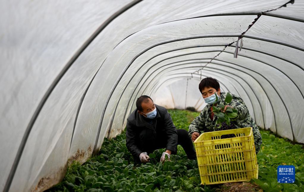 1月7日,西安市未央?yún)^(qū)西唐寨村村民陳跟娃(左)和愛人陳彩俠在自家的菜地里收菜。