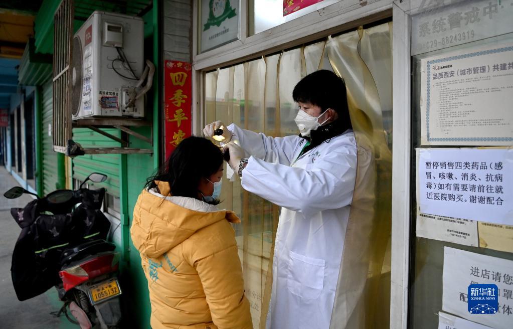 1月7日,西安市未央?yún)^(qū)西唐寨村一家藥店的負責人韓春陽在為村民看診。疫情發(fā)生后,藥店一直沒有關(guān)門,韓春陽每天會接到六七個線上線下的咨詢,下班后還會給鄰近村子的村民送藥。