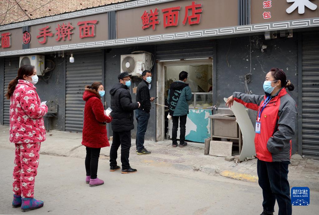 1月7日,西安市未央?yún)^(qū)西唐寨村志愿者在村內(nèi)店面前維持秩序。