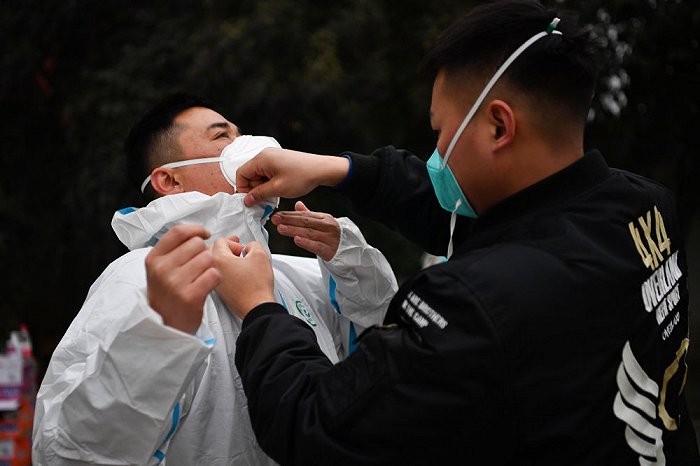 ↑1月7日,西安市雁塔區(qū)退役軍人志愿突擊隊(duì)隊(duì)員在一處核酸檢測點(diǎn)互相協(xié)助為防護(hù)服消毒。