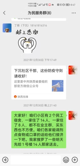 看著手里拎的幾顆白菜、蘿卜、西紅柿,我感到慚愧難當(dāng),作為一名黨員、一名下沉干部,實(shí)在是失職,沒有履行好“民之所憂,我必念之;民之所盼,我必行之”的使命擔(dān)當(dāng)。投送完愛心菜到家后,我立即在群里倡議小區(qū)下沉干部對1-3-2302的務(wù)工人員開展愛心救助活動,并從自家的抗疫儲備物資里勻出了2袋子蔬菜、豆腐乳、魚醬罐頭、口罩、水果等物資,并附上了溫馨小紙條,寫上我的聯(lián)系電話,鼓勵他們堅(jiān)定克服困難的信心和決心。第二天,社區(qū)領(lǐng)導(dǎo)、小區(qū)鄰居們得知情況后,紛紛伸出援助之手,不到半小時,鍋灶有了、菜刀案板有了、糧食蔬菜也都有了…,社區(qū)的慰問品也送來了。大伙不僅給他們送去了物資,更送去了關(guān)心和安慰,他們的生活起居也迅速融入了小區(qū)大家庭,業(yè)主群里每天都有人對他們噓寒問暖,他們也經(jīng)常在業(yè)主群曬他們做的川味美食。他們私下跟我說,這幾年,他們在湖北、新疆等地都遇到過疫情,但最讓他們感動的還是西安,黨和政府的細(xì)致安排、西安人民的熱情相助,讓他們在他鄉(xiāng)異地孤立無援時,第一次感到不慌了。