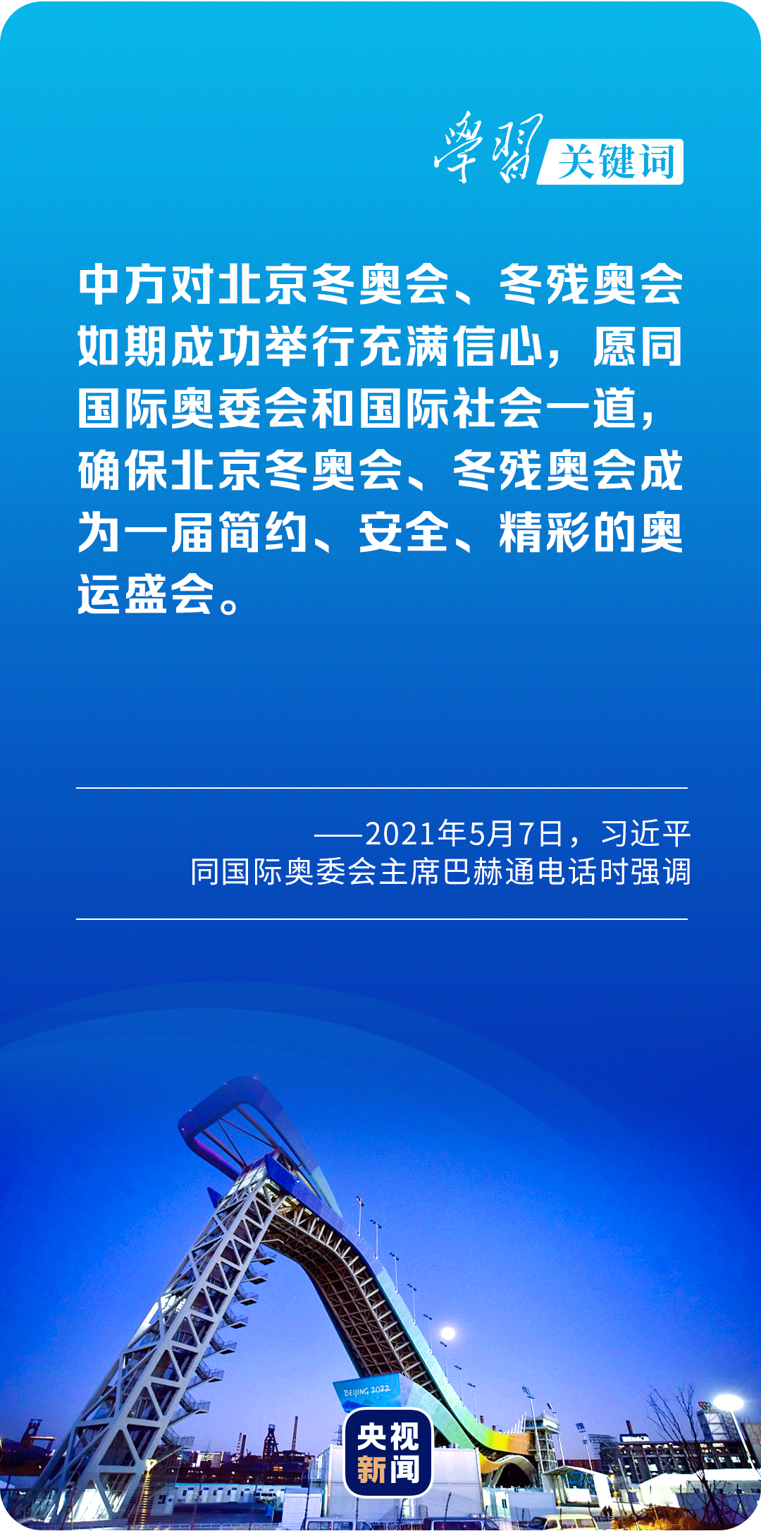 2022年1月,在北京考察2022年冬奧會、冬殘奧會籌辦備賽工作時,習(xí)近平總書記強(qiáng)調(diào),辦好北京冬奧會、冬殘奧會,是我們向國際社會作出的莊嚴(yán)承諾。經(jīng)過幾年努力,各項(xiàng)籌備工作基本就緒,我們完全有信心、有能力為世界奉獻(xiàn)一屆精彩、非凡、卓越的奧運(yùn)盛會。