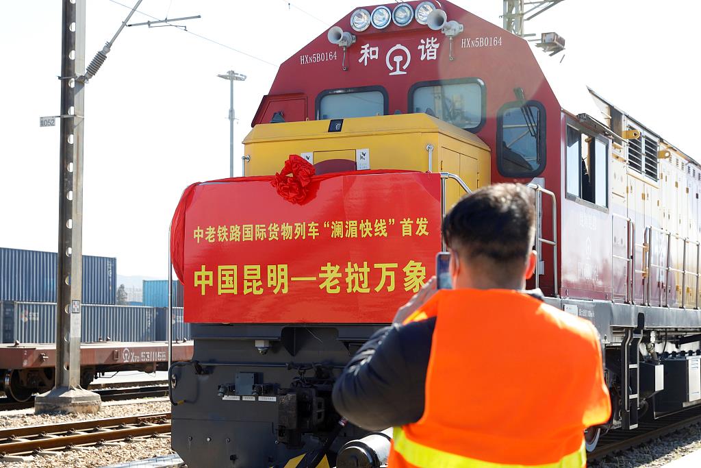 ▲2022年1月10日,中老鐵路時速120公里國際貨物列車“瀾湄快線”首發(fā)。